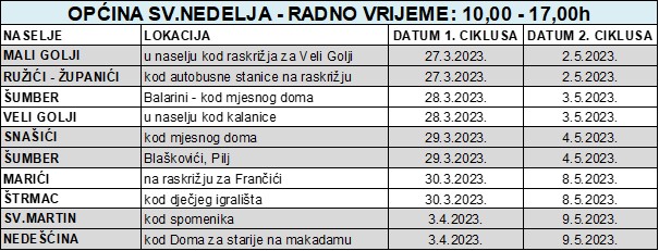 Mobilna reciklažna dvorišta (MRD) u ponedjeljak (27.3.2023.) biti će postavljena u Malim Goljima (blizu raskrižja za Veli Golji) i u Ružićima (kod autobusne stanice na raskrižju sa cestom Sv.Martin-Šumber, odnosno sa cestom prema Županićima). Radno vrijeme je od 10,00 do 17,00 sati. Kraj MRD-a dežurati će i radnici 1.MAJ-a.
