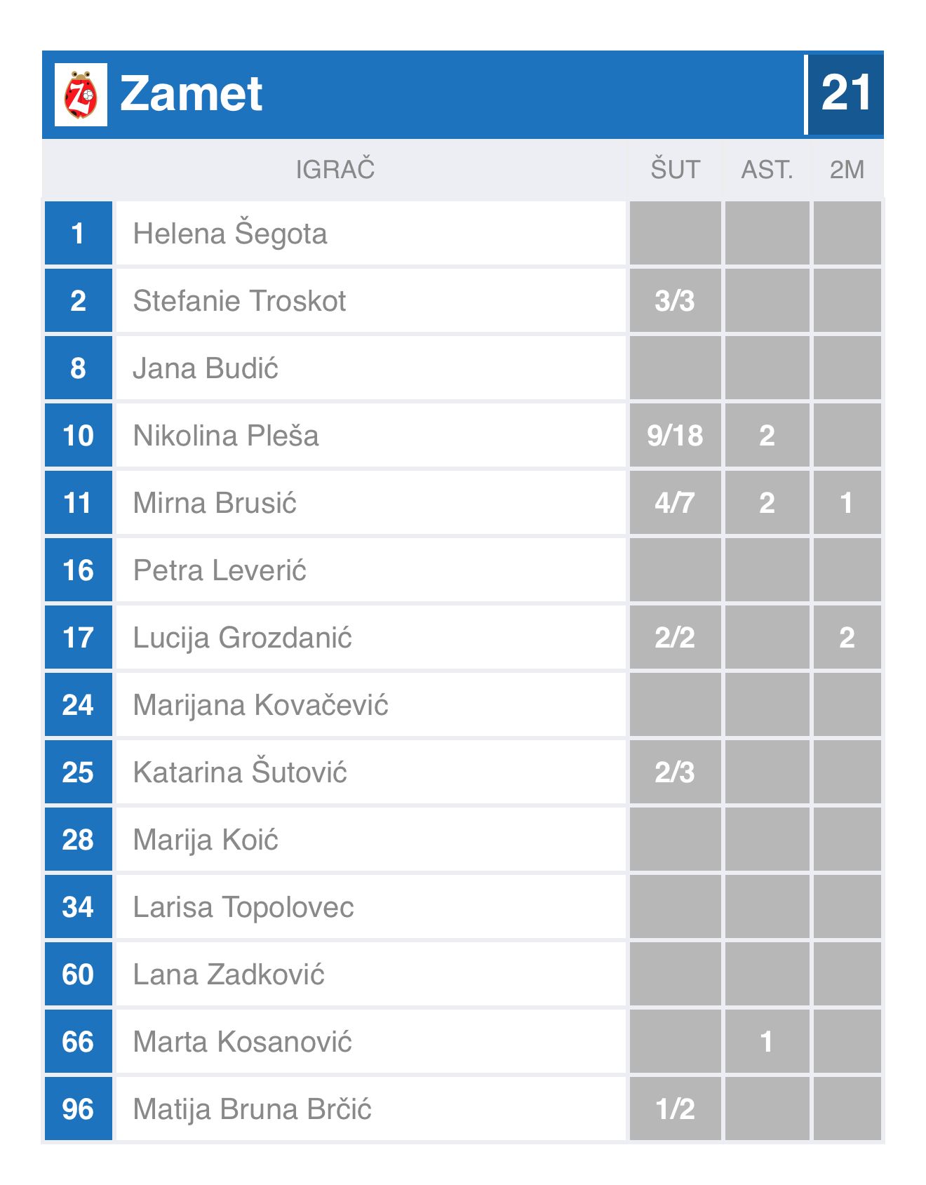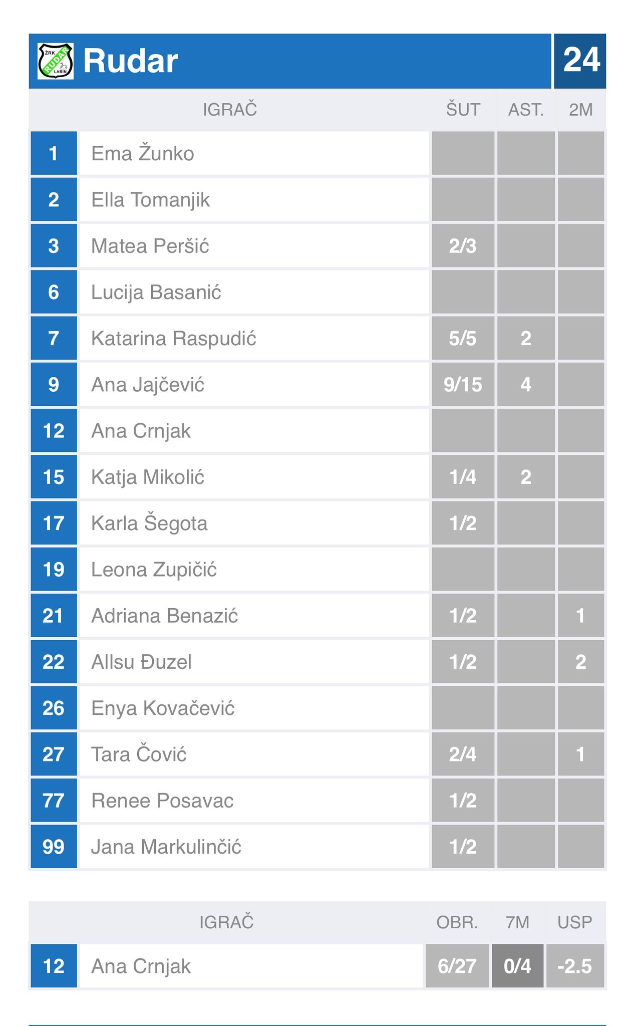 Nakon početnog ispitivanja snaga, Riječanke prve rade veći niz od tri pogotka za redom i preuzimaju vodstvo (4:6). I uspijevaju ga sačuvati do predaha. Nije bilo veliko (11:12), ali ne sumnjamo da im je bilo važno i drago. A osim toga, jamčilo nam je uzbudljiv nastavak. I doista. Zamet u 36. minuti ide na dva pogotka prednosti. Tada stvari u svoje ruke uzimaju Ana Jajčević i Katarina Raspudić i domaćinu osiguravaju seriju od 7:1 te vodstvo od četiri pogotka razlike (20:16). I tu je bio kraj priče i nadanja Riječanki u slavlje. Nisu dakako odustale, ali u završnih desetak minuta igralo se pogodak za pogodak i Rudar je na kraju slavio (24:21). Već spomenuti dvojac Ana Jajčević (9) te Katarina Raspudić (5) dale su 14 od 24 pogotka domaćina. Kod gošći najbolja Nikolina Pleša s devet pogodaka.(HRS)11.10.2025./21:52:42